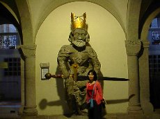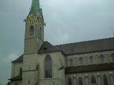 | グロースミュンスターです。右上はジャコメッティが作ったステンドグラスです。左下は地下聖堂にあったカール大帝です。この像がある地下聖堂は11〜12世紀のものだそうです。シーンと静まり返っていました。 |