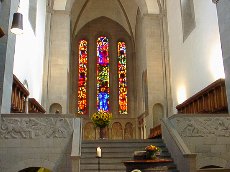 | フラウミュンスターの中です。左上がシャガールの描いたステンドグラスです。それぞれの色が素晴らしいステンドグラスで、しばらく見とれていました。 |