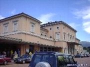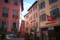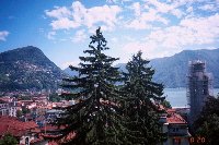 | 左の写真はルガノ駅です。少しクリーム色っぽい色合いが、イタリアっぽい雰囲気を表しています。駅の外に出ると、黄色い帽子をかぶった背の高い男の人たちが、何か配っています。そこには「ファンタ・レモン」の宣伝マンたちがたくさんいました。私も150ミリリットルの缶を2本もらいました。 駅は小高い丘の上にあります。道を渡って湖側を見ると、山々と湖の風景が広がっています。 |