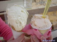 | イタリアといえばジェラートということで、もちろん買ってみました。街のあちこちにジェラート屋さんが出ています。メロンとストロベリーのジェラートです。量もたっぷりでしたが、とてもおいしくてあっという間に食べてしまいました。 |
