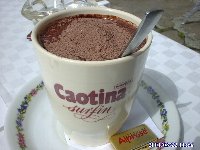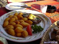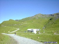| 最後の急な坂道を登って、ちょうど1時間半くらいかけてファウルホルンに到着しました。ここは山の頂上にレストランがあります。今まで登ってきた道がず〜っと見渡せるとても眺めがいい場所にテーブルが並んでいました。標高が高いだけあって、太陽が雲に隠れると急に寒くなります。 12時だったので、お昼ご飯にしようと思いました。メニューを見るとずっと食べたいと思っていた「ケーゼシュニッテ」があります。これはパンの上にチーズを乗せてオーブンで熱したスイス風のチーズトーストです。固くなったパンなどをおいしく、また量をふやして食べる知恵だったのかなぁと思いました。このレストランの物は、名前に「ファウルホルン風」と付いているだけあって、本などで見た物とはちょっと雰囲気が違ってグラタン風でもありましたが、体が温まって本当においしかったです。飲み物はすっかり大好きになった「コールドチョコレート」。冷たいミルクにちゃんと溶けて、疲れが飛んでいくようなおいしい甘さでした。 |