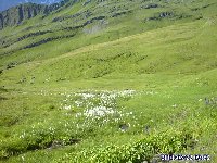 フィルストの駅からのハイキングコースは、最初の5分くらいだけ上り坂ですが残りはほとんど平坦な道です。咲き乱れるという表現がぴったりなほど、いろいろな色のお花が咲いています。そんなお花や遠くの山々を見ながら、のんびりと歩きました。途中、バッハアルプゼーから戻ってきたと思われる人たちとすれ違いました。朝早くから歩いたんだなぁと思いました。 |