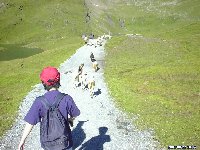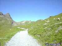 ファウルホルンを1時頃に出発し、ブスアルプまで下ることにしました。 この道は、ファウルホルンの頂上を背にしてひたすら下っていきます。牧草地にコースが設定されていて、次はどこ?とコースを表すペンキを塗った石を探しながら歩くのが、とても楽しかったです。 |