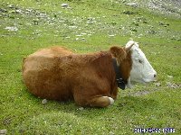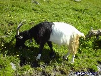 | フィルストからハイキングを始めると、黒と白のツートンカラーの山羊がいました。牛に比べると小さな小さなカウベル(?)を首につけて、一生懸命お花や草を食べていました。写真をクリックすると動画にリンクしています。(458KBです) |