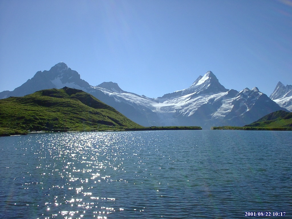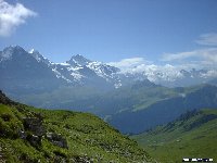 | 8月22日 今日も朝からとてもいいお天気です。アイガーが少しずつ明るくなっていくのをベランダから眺めました。 さわやかな朝の風景とは対照的に、私たちの動きはとてもぎこちなくなっていました。それは・・・ひどい筋肉痛が原因!昨日のハイキングはかなりしんどいものだったので、二人とも歩くのが精一杯といった感じでした。でもこの感覚、いつか体験したことがあるような気がする、と考えてみると、高校の時の部活の合宿だ〜と思い出しました。1日で体のあちこちがたまらなく痛くなって、それでも翌日もまたハードに練習をするというあの合宿の感覚でした。そういえば会社の後輩Oさんに、「ゆっこさんのご夫婦は、毎年夏休みに山登りの合宿をされるんですか?」と言われて慌てて「ハイキングだよ」と訂正したことがありましたが、今年はまさしく合宿かも・・・と思いました。 朝ご飯を食べて8時過ぎに出発しました。今日はまずグリンデルワルトからフィルストまでのゴンドラに乗り、バッハアルプゼーまで歩きます。 |