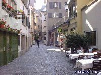 8月24日 今日で楽しかったスイス旅行もお終いです。また雲一つないいいお天気で、朝から空の色が本当にきれいでした。去年もおいしい〜と思ったこのホテルのクロワッサンなどをいただきながら、外を眺めました。通勤中のサラリーマンさんたちが、新聞を片手に市電に乗っていきました。 食事が終わってお散歩に出かけました。 |
