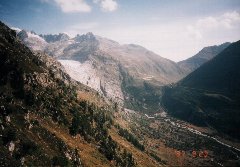 | 向こうに見えるのがローヌ氷河です。これから、下に見えるくねくねと曲がった道を下りていきます。 |