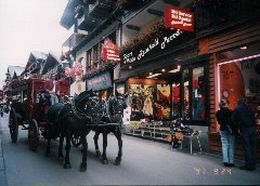 | ツェルマットに到着です。この町は環境保護のために車は乗り入れることができません。馬車と電気自動車だけが走っています。写真はちょうど通っていったどこかのホテルの送迎馬車です。 |