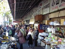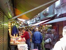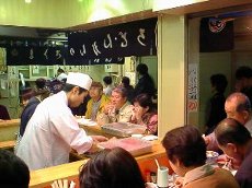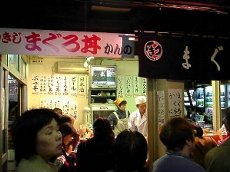 | 築地市場の駅に着くと、ビニール袋や発泡スチロールを持った人々が・・・。みなさんたくさん買いこんで帰ってくるところです。駅を出ると50メートルくらいで上の写真の様なお店街に入ります。小さな隙間から中の方に入っていくと、どんどんいろんなお店が見えてきます。 海産物を売っているお店、食器や道具を売っているお店、卵焼きや焼き鳥を売っているお店・・・本当に様々なお店が並んでいます。威勢のいいかけ声で、通る人々を呼び込んでいるお店の人々。「なずな」や「松さん」が出てきそうです! |