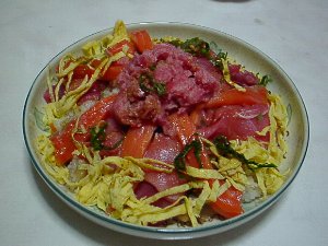 | 丼を食べた後、あちこちのお店を見て回り、結局まぐろを買って帰りました。「一皿1000円にするよ」というかけ声で、あっという間に1000円札が出ていました。本当は大江戸線を一周して帰ろうかしら?と思っていたのですが、お刺身があるということでそのまま最寄り駅まで帰りました。 築地はとっても活気がある町だなぁという印象です。もっと早起きして、今度は市場の方の活気も見てみたいです。移転の話も出ているようですが、どうなるのでしょうか。ちょっと気になります。 まぐろはスーパーで買ったお刺身を加えて、海鮮丼になりました。お昼も丼、夜も丼でしたがとってもおいしくて大満足のおでかけになりました。 |