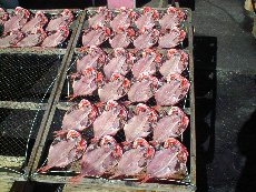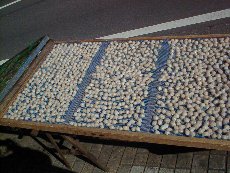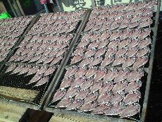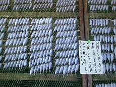 | 海岸沿いはひものストリートと言えるくらい、干物やさんがずら〜っと並んでいました。珍しいところでは、左上の「枝の葉」という干物と右下の「いかの口」という干物は初めて見ました。 枝の葉は、串に7匹ずつさして干してあります。これは上に説明が書かれていたのですが、船頭さんが船の上からこの小魚を見ると、葉っぱが漂っているように見えるところからこう呼ばれるようになったということです。とても小さい魚でした。 いかの口は、いかの口の部分なんでしょうか・・・?ずら〜っと一面に並んでいました。このお店はこれが売り物らしいのですが、いかのその他の部分はどうしているんだろうと不思議でした。 |