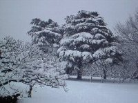 | 雪をたくさんかぶっている御苑内の木々です。 右の写真の木は雪の重さで枝が地面につくほどしなっていました。雪で真っ白になった大きな杉の木を見ていると、子どもの頃に読んだ「森は生きている」の本を思い出しました。 |