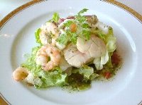 | 新宿西口を出ると、巨大なビル街が目に入ります。初めて上京したときは、ビルだらけの風景に本当にびっくりしました。 その中にある野村ビルには、50階と49階に展望レストランがあります。そこで、ホテルオークラのトップハットに行くことにしました。ランチなので、コースもとってもお得なお値段でした! 右は前菜のシーフードマリネ。エビもホタテもぷりぷりでした。 |