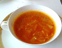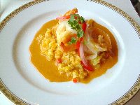 | 次は、トマトベースの野菜スープ。思ったよりあっさりしたお味でした。そしてシーフードはエビとバターライスです。このソースがエビの風味たっぷりで、本当においしかったです。エビもとても大きかったです。お肉はヒレ肉のステーキガーリック風味です。お肉の上に白髪ネギがいっぱいのっていて、和風のお味でした。 | |