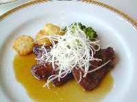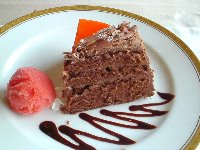 | デザートはチョコケーキとムースケーキとシャーベットの盛り合わせ。このシャーベットがイチゴ味で、本当にちゃんとイチゴで作っている〜という感じがしました。すっぱい果物が苦手の主人もおいしいおいしいと食べていました。 どれも量が多くて、少し食べてはお皿を交換する・・・を繰り返していたら、主人は結局1.4人前くらい食べることになってしまいました。 |