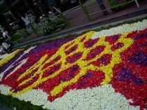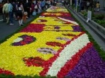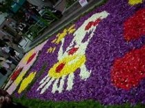 | 次から次へと様々なカーペットが並んでいます。 すいか、タイ蒲鉾、うちわ、いか、チューリップなどどれも見事なカーペットです。こんなにたくさんの花びらを敷きつめるのは本当に大変だったと思います。そしてその花びらはどうやって運んだのかしら?とても不思議です。 |