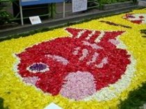 | みゆき通りに入るとすぐ、「2001」というカーペットがありました。赤、黄、紫、ピンク・・・と色とりどりのチューリップの花びらが敷きつめられた通りが、とてもきれいです。ほのかにチューリップの香りがしました。 獅子舞、鯉のぼりのカーペットです。 |