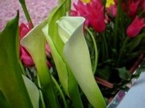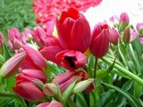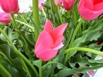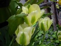 | 道の途中には、チューリップが咲いたプランターも置かれていました。 左上はとがった花びらの形が珍しいと思いました。上は1本の茎に4〜5輪の花が咲いていました。ちょっと重そうに感じるくらい、お花がいっぱい咲いています。下のチューリップは、白に緑が入っています。こんな珍しい色は初めて見ました。 |