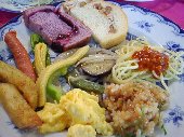 | 20日の海の日、目が覚めると外はいいお天気。鳥の鳴き声が聞こえました。 ペンションは「1960 イマジン」という所で名前通りビートルズファンのオーナーさんが経営されています。普通にビートルズはいいなぁと思う私たちも、いろんなコレクションに見とれるくらいだったので、ファンの方にはたまらないと思いました。 朝ご飯はバイキング形式です。焼きたてのパンが何種類もあって、おいしかったです。 |