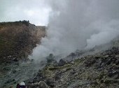 | 30分ほど歩くと牛ヶ首に到着しました。ほとんどは平坦な道ですが、所々登りがあります。 そして左下の様に硫黄の臭いがする煙が吹き出しているところが何カ所かあります。その場所は石もかなり熱く、活火山なのだということを改めて感じました。 |