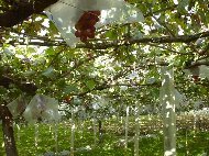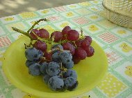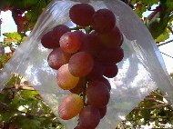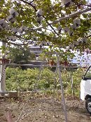 | 高速を下りるとすぐにぶどう園が見えてきます。「左折するとぶどう街道」という看板が見えたので、あちこち見てから入ろうと左折することにしました。 少し行くと道路で「どうぞどうぞ」と手招きしているおばあさんがいました。母屋とぶどう狩りの店舗になっている建物、そしてお庭はぶどうの棚がずら〜っと並んでいる小さなぶどう園でした。車をおりるとお皿に試食のぶどうが出てきます。今の季節は巨峰は終わって「甲斐路」と「ベリーA」という品種がおいしいということで、その2種類を試食しました。少し食べると、おじさんが「ではぶどう狩りに行きますか?」とおっしゃってワゴンを運転してくださいました。このワゴンで、ほんの1〜2分行くと甲斐路のぶどう畑に着きました。手を伸ばせば届く位置にたくさんの甲斐路がぶら下がっているぶどうの木の下に入っていきました。 |