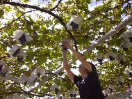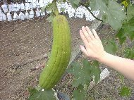 | とても甘かったベリーAも狩ることにしました。これはおうちの庭にあるということでした。棚はとても高くて脚立に上って狩ります。脚立なんて久しぶりでちょっとこわごわとした手つきになってしまいましたが、大きくて重そうなベリーAを1房狩りました。 ぶどう園を出て、勝沼ぶどうの丘に行きました。その途中、ぶどう畑の横にへちま畑がありました。大きな大きなへちまがたくさんなっていました。私の手と比べるとかなり大きいことがわかります。 |