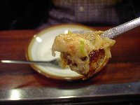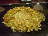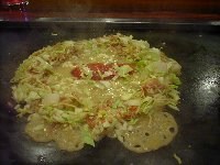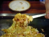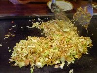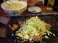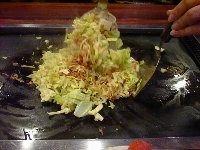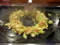 | まずは「もちチーズ明太」というもんじゃ焼きを注文しました。運ばれてきたお皿には、角切りにしたお餅がごろごろと見えます。そして明太子が一腹。最初はお店の方に作っていただくことにしました。 油をひき、お皿を水平にしたまま上の材料だけを鉄板に乗せます。このとき、明太子は取っておきます。キャベツなどの材料を、ざっと炒めます。 |