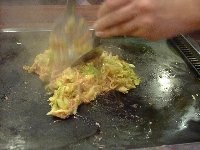 | 鉄板で少し焦げ目を付けながら食べていきます。 お餅とチーズがとろけて、その中に明太子のピリッとした辛さがあって、とてもおいしいもんじゃ焼きです。 |