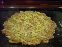 | とろりとしてきたら、堤防してあった材料と混ぜて炒めます。よく混ざったら、平らに薄くのばして、上にチーズを散らします。チーズが溶け、下の生地に少し焦げ目がついてパリパリとしてきたら、出来上がり! | |