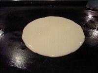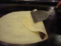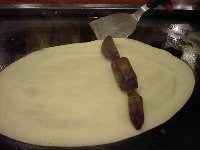 | 最後に主人お薦めの、「あんこ巻き」を注文してみました。これはお店の方に作っていただくことにしました。 生地を鉄板に落とした後、スプーンを使って楕円形に薄くのばしていきます。 |