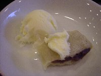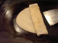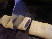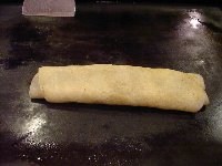 | 何回か折って、くるくると丸めていきます。巻き終わったら出来上がり! 小さく切っていただきました。主人が年末に行ったお店では、アイスクリームと一緒に出されたということで、アイスクリームを注文して一緒に食べてみました。あったかいあんこ巻きと、冷たいアイスが口の中でとろけて、おいしい〜!あんこ巻きの生地の味もとてもおいしくて、この味を思い出して今でも「とろ〜ん」とした顔になってしまうほどです。 |