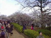 | 梅ヶ丘駅の北口を出て、1つ目の横断歩道を渡るとすぐに羽根木公園に到着します。徒歩3分ほどです。入ってすぐに階段があり、両側に梅の木が並んでいます。 |