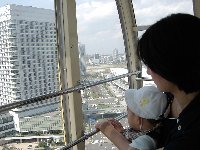 | チケット売り場に行くと、観覧車は1人700円でした。3歳からというアトラクションが多い中、観覧車は保護者同伴であれば大丈夫だということでした。観覧車の行列もまだ短く、10分ほどの待ち時間で乗り場に到着できそうでした。そして驚いたのは、今年から「冷暖房完備」になったこと!これなら今日の様に暑い日も、冬の寒い日も大丈夫だわと思いました。 混んでいる日は相乗りもあるそうですが、今日はグループ毎に乗ることができました。段々と高くなっていく観覧車から、外の景色を眺めました。横浜の街、ベイブリッジ、海の上の船などなど、きれいな景色が広がっていました。しゅんも手すりにつかまって、立ったり座ったり、気ままに楽しんでいるように見えました。 |
