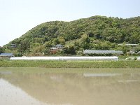 | ビニールハウスは2カ所に分かれています。ひとつは道路沿い、そしてもう一カ所はこんな水田の横のあぜ道を歩いた向こうにあります。近くに見える山々、そして田植えが終わったばかりの水田。あぜ道には花がたくさん咲いていて、本当にのどかな風景です。主人は「ここを歩いているだけで、休日〜っていう気分が盛り上がってきた」と言っていました。田舎育ちの私は、どちらかというと懐かしいという気分だったのですが、こんな空気を吸うのは久々で、やっぱり休日気分が盛り上がってきました。初めてあぜ道を歩くしゅんは、土の感触にニッコリ。何度も振り返って笑っていました。お食事エプロンも身につけて、いちごを食べる準備も万端です。 |
