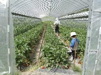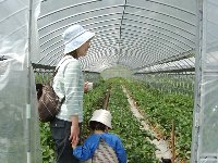 | まずはこのビニールハウスに入ってみることにしました。ご覧の通り、私たち家族の貸し切り状態です。 最初はしゅんと手をつないで、ソロリソロリと歩いていたのですが、「あ、いちご、ここにもいちご〜」とすっかり舞い上がった私は、ズンズン進んでいつの間にかしゅんから遠ざかり・・・。それでも「いちご、たべゆ〜」としゅんは必死でついてきて、主人だけがポツリと残された様です。 |