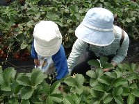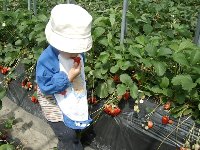 いちご狩りを満喫| 車に戻ると、まだ1時すぎでした。旅行の前にもねさんに教えて頂いたいちご狩りの農場がすぐ近くにあることがわかったので、電話で確認をしてみると、優しそうなおばあさんが「どうぞ、いらしてくださ〜い」と仰いました。 場所は富津館山道路の鋸南保田インターの目の前です。車を止めるて目の前のビニールハウスに入り、「いちご狩りをしたいのですが」と声を掛けました。 こちらの農場は、何と時間制限なしでいちご狩りができるのです。もちろんコンデンスミルクもお代わりOK!1人1000円ですが、しゅんは無料なので2000円を支払って、ミルクのカップとヘタを入れる袋を受け取りました。そしておばさんからのアドバイスを受けました。ミルクはヘタの方にちょっとだけつけて、ヘタ側から口に入れるのがおいしい食べ方なのだそうです。いちごは先っぽに行くほど甘みが強いので、こうやって食べると最後まで甘みを十分に感じることができるのだとか。アドバイスを有り難くちょうだいし、さ〜、食べましょう〜といくつか並んでいるビニールハウスを見て回りました。 |
