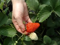 | ここ数日、急に気温が上がったため、たくさんのいちごが赤くなった状態で痛み始めていました。大きくて甘そうなのに、もったいない〜と思ういちごがたくさんありました。もう1週間早かったら・・・と何度も思いました。 それでも、こんな風においしそうないちごもたくさんあって、見つけるたびに「甘い、甘〜い」と言いながら口に運びました。お店で買ったいちごとは全然違う、全体がすご〜く甘いいちごは、色も真っ赤でみるからにおいしそうでした。 いちご、いちご・・・と食べ続けた(主に)私としゅんは、気付くと手が真っ赤になっていました。しゅんなどは、口の周りも真っ赤っか。そしてどこかで尻もちをついてしまったのか、お洋服も真っ赤っかでした(きゃー)。 |