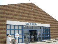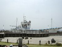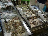 | 白い船を横目に見ながら、ショップの建物に入りました。左右にお土産やさんが並び、真ん中には生け簀が置かれていて、様々な魚介類が売られていました。さざえやホタテ、蛤などなど、「これ買っていってバーベキューしようよ」というお客さんの声が聞こえてきましたが、新鮮でおいしそう!と私も思いました。 眠たいのかお腹が空いたのか、ベビーカーを思う存分押せなかったのが気に入らないのか、ご機嫌斜めのしゅんが私に抱っこされながら暴れていましたが、「あ〜、おいしそう」「わ〜、食べたいねぇ」と言いながら、見て回りました。まだあと1泊残っているので生鮮品は買えない私たちは、これまたもねさんに教えて頂いた「落花生の甘納豆」をお土産に買いました。 |