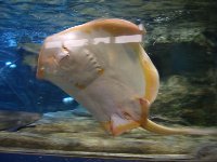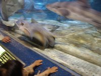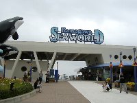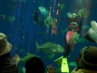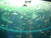 | ぐるりとまわるスロープを下りていくと、「無限の海」と名付けられた大きな水槽の前に出ます。ぐるりと下りていったのは、この水槽の一番上から下まで下がっていったということだったのです。見上げるほどの高い水槽の中で、大きな魚たちがスイスイと泳いでいます。 大人もジーッと魅入ってしまうような光景ですが、しゅんもあっちへこっちへと泳いでいくお魚にみとれていました。 ちょうどフーディングショーの時間になったので、そのまま見学することにしました。ウェットスーツを着たお姉さんが、それぞれの魚用に用意されたえさを持って、水槽に入ってきました。まずは小さな魚用、次に少し大きな魚用と、えさをパーッと広げるたびに、対象の魚がパクパクと食事を始めます。これは一日に一度のショーだったようですが、ちょうど良いタイミングでした。 ずっと前に2度ほど来たことがあり、またいつか来たいと思っていたシーワールドですが、こうしてしゅんと訪れることができて嬉しかったです。海がすぐそこにあるので、シャチのショーなどはまるで海に向かって飛んでいってしまうのでは・・・というような迫力があります。最近行った動物園でも感じましたが、水族館でも水の中の生物の様子を興味深く観察できるように色々と工夫されるようになったのではと思いました。 |