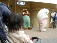 | 途中、こんなぬいぐるみ達に遭遇!白イルカとオットセイでしょうか?「一体何?何なんですか?」というように、呆然と見つめているしゅんでした。 |