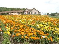 | 入り口近くのフラワーガーデンに戻って、お花畑の中を歩きました。「お花摘み」の看板を見つけて行ってみると、「10本200円」という貼り紙とお金を入れる箱が置かれていました。 この旅行では、できたらお花摘みをしたいと思っていましたが、できそうな場所を通るのは2日目だから無理かなとあきらめていたので、すっかり嬉しくなってイソイソと摘み始めました。以前ポピーを摘んだ時は、きれいだなと思って咲いている物を混ぜて摘み取りました。でもポピーは、早ければつぼみもその日の夜には開き始めるということがわかったので、今回は、これは一体何色だろう?と思いながらつぼみだけを摘み取りました。 |