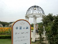 | フラワーガーデンには「幸運の鐘」という鐘があります。時々カラーンカラーンと良い音が響いていたのですが、それはこの鐘だったのです。では私たちも・・・と交代で鳴らしてみましたが、意外と難しくて優雅にカラーンというわけにはいかず、「えいっ、えいっ」と必死にロープを振り回してしまいました。 |