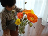 | お花摘みをしている私としゅんです。ポピーが本当にきれい!そして私が後ろを向いていたりうつむいていたりするところが、また良い感じだと主人が失礼なことを言いました。でも確かにその通りかも。 |
