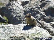 | ミラーレイクから20分ほどで、「レイクアグネス」に到着です。レイクルイーズやホテルがかなり下の方に見えて、高いところまで登ってきたんだなぁと実感しました。湖のほとりにティーハウスがあったので、ストロベリーティーを飲むことにしました。写真右のように、リスや鳥が人間のすぐ近くまでやってきます。特に鳥には要注意で、クッキーやサンドイッチをつまんでいた外国人のグループの方々は、飛んできた鳥に手からさらわれて驚いていらっしゃいました。 |