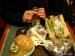 | 夜ご飯は、ホテル内にある24時間営業の「シャトーデリ」というカフェに行きました。サンドイッチ、ハンバーガー、スープ、デザートのパイを買って店内で食べることにしました。二人でこれだけでしたが、ご覧の通りひとつひとつが大きくて、すっかりおなかいっぱいになりました。 |
