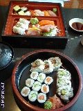 | 夕食は「KOJI」へ行きました。JTBのクーポンのコースでしたが、写真右のお寿司の他に鮭のイクラ乗せ、お刺身、牡蛎、メープルシロップのアイスクリームがつきました。ちなみにこのお寿司は一人前で、もちろん私には食べ切れませんでした。写真左はカナダの地ビール「カナディアン」と「コカニ」です。水がおいしいから飲みやすいそうです。普段お酒を飲まない私にも飲みやすく、すっかり酔ってしまいホテルに着いてすぐに熟睡しました。 |