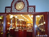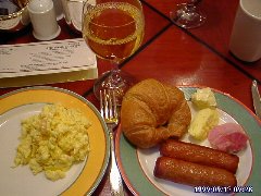 | バイキング形式の朝食です。右下はイカ巻きのようですが、ソーセージです。私はグレープフルーツのジュースを頂いたのですが、ジュースサーバーが壊れていて、コップを離してもどんどんジュースが出てきてパニックに陥ってしまいました!「エクスキューズミー」と叫ぶ私に、「コップを離せば止まるのよ。」と最初はちょっぴり冷たかった忙しそうなウエイトレスさんも、何杯もコップを早業のように替えながらジュースを注ぎ続ける私にやっと気づいて、大笑いしながら助けてくれました。 |