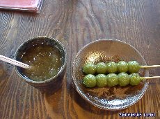 | 銀閣寺を出たところにあったお店に入って休憩しました。左は私が何かで読んでからずーっと飲みたいと思っていた「ひやしあめ」、右は「茶だんご」です。ひやしあめは少し凍ったしゃりしゃりした舌触りでした。味は、冷たい生姜湯でした! |