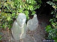 | 吉備姫王墓内に置かれている猿の形をした石像、猿石です。吉備姫王は、天智天皇の祖母で、皇極天皇の母にあたる人です。 江戸時代には、女・山王権現・僧・男と呼ばれていたそうです。誰が何のために作って置いたのでしょうか? |