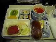 | 機内食です。左は離陸後1時間半くらいで出た昼食です。和食を選んだら、思ったよりとてもおいしくてびっくりしました。右は着陸2時間前くらいの軽食です。映画を観たり音楽を聴いたりしているうちに、パリ、シャルルドゴール空港に到着しました。 |